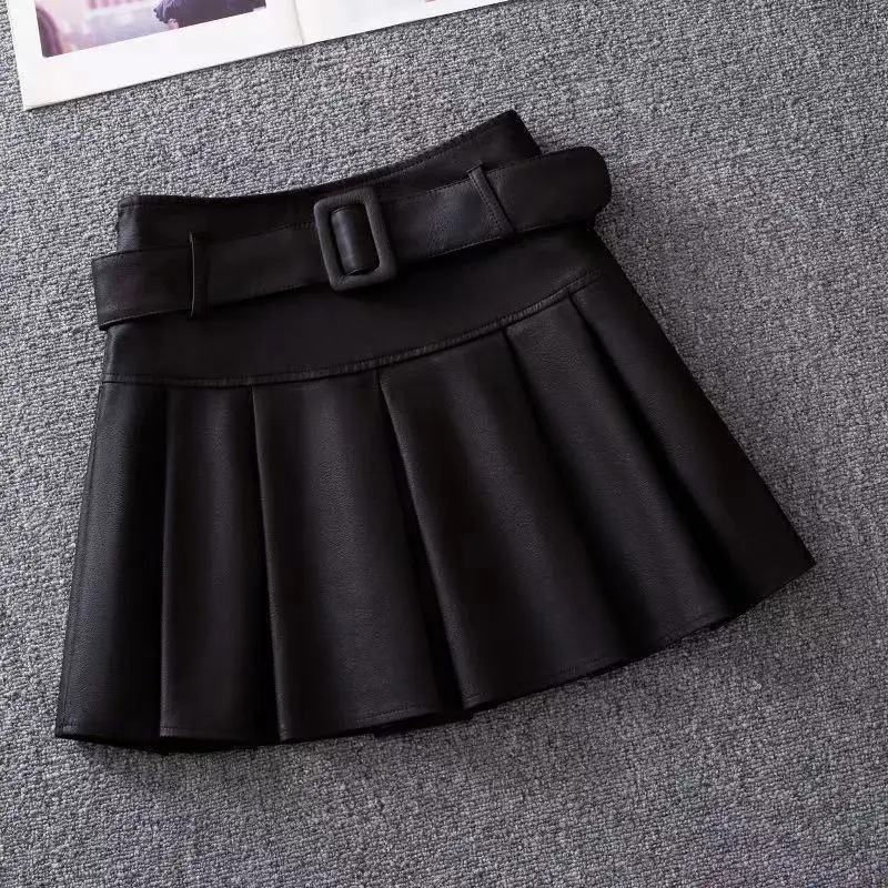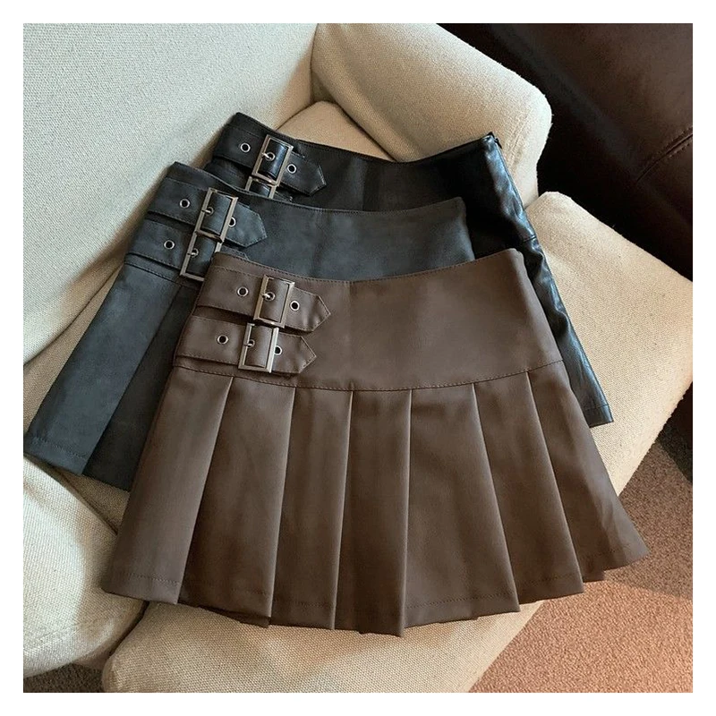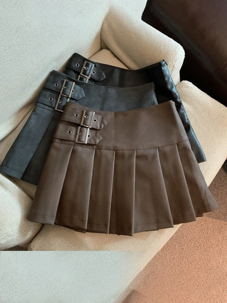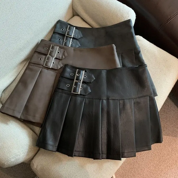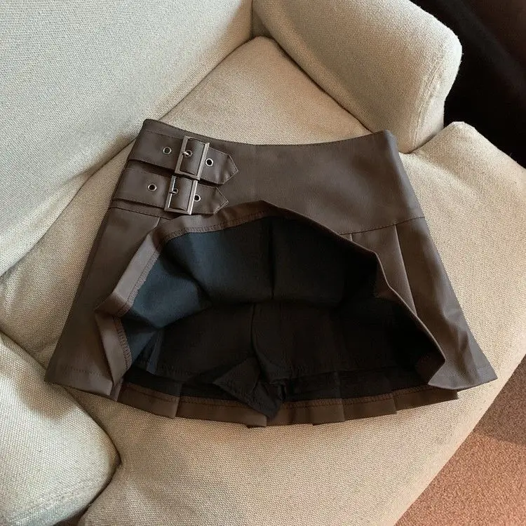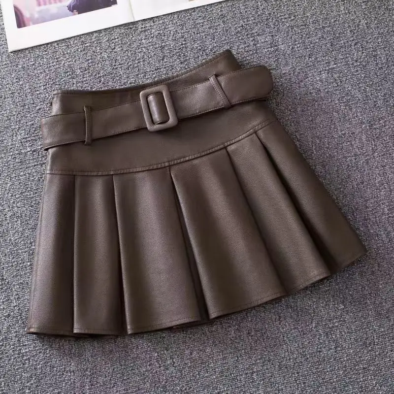 Coffee leather skirt for women, high waisted A-line pleated short skirt, fashionable and trend