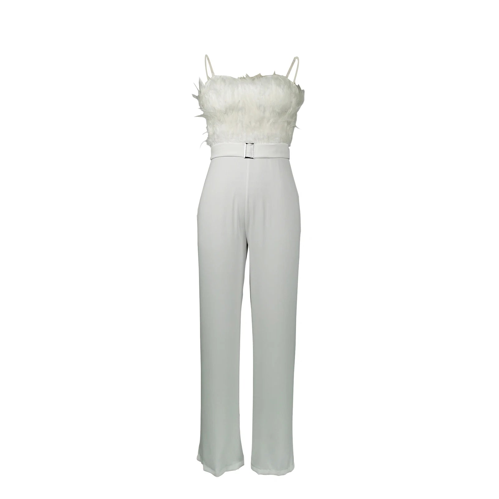 Elegant Jumpsuit Women Sleeveless Off Shoulder Plush Feather Belt Buckle Long Romper Chic High Waist Straight Leg Jumpsuit