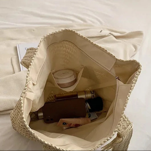 Step into summer in style with this Elegant Ladies Straw Woven Handbag! This stunning tote is the epitome of coastal sophistication, perfect for a day at the beach, a commute to work, or a casual lunch date. The natural straw material and classic retro design evoke a sense of vintage glamour, while the top-handle and sturdy straps ensure it's both practical and comfortable to carry. With its spacious interior and elegant silhouette, this handbag is the perfect companion for any summer outing. Pair it with a flowy sundress, distressed shorts, or a classic white shirt for a look that's effortlessly chic and undeniably sophisticated!