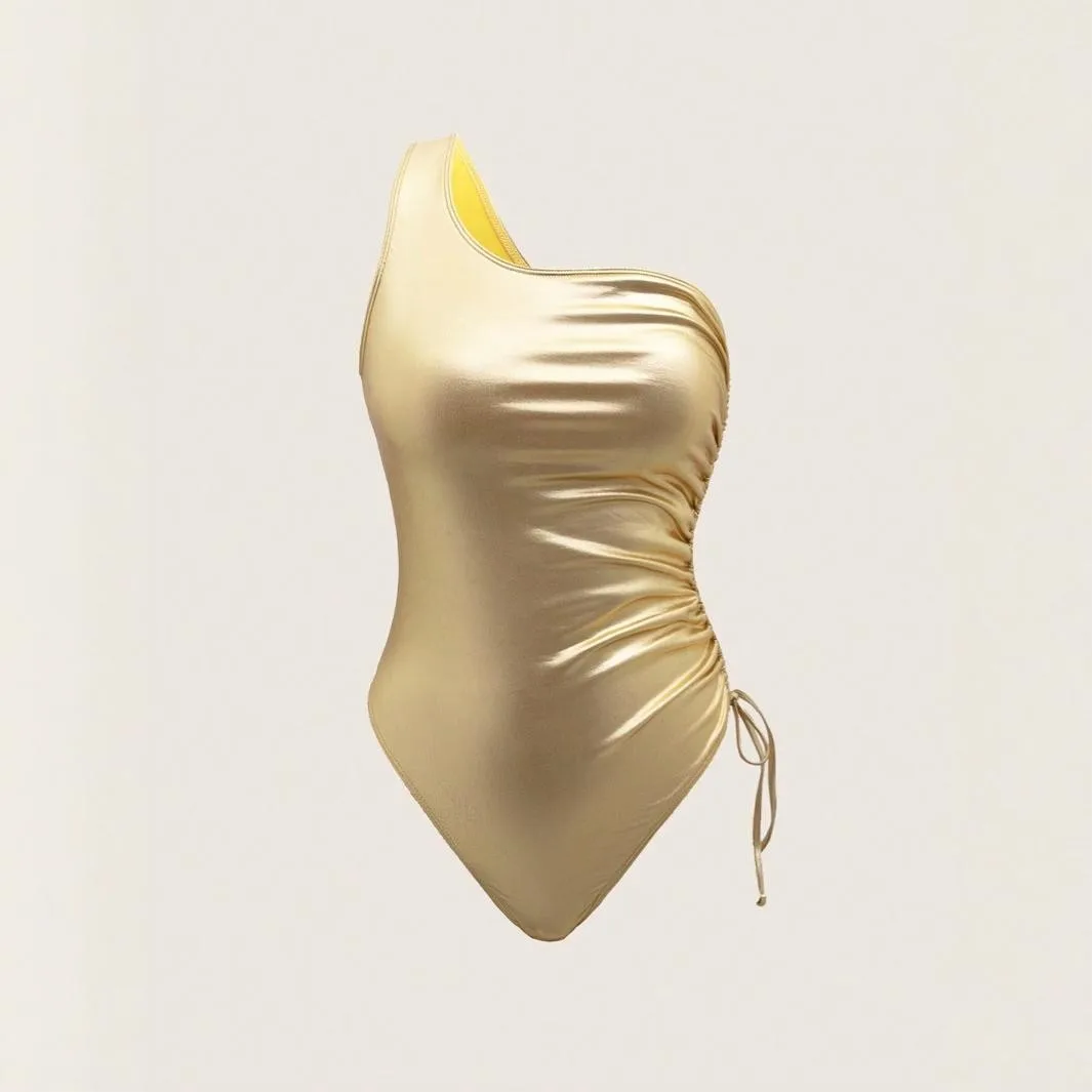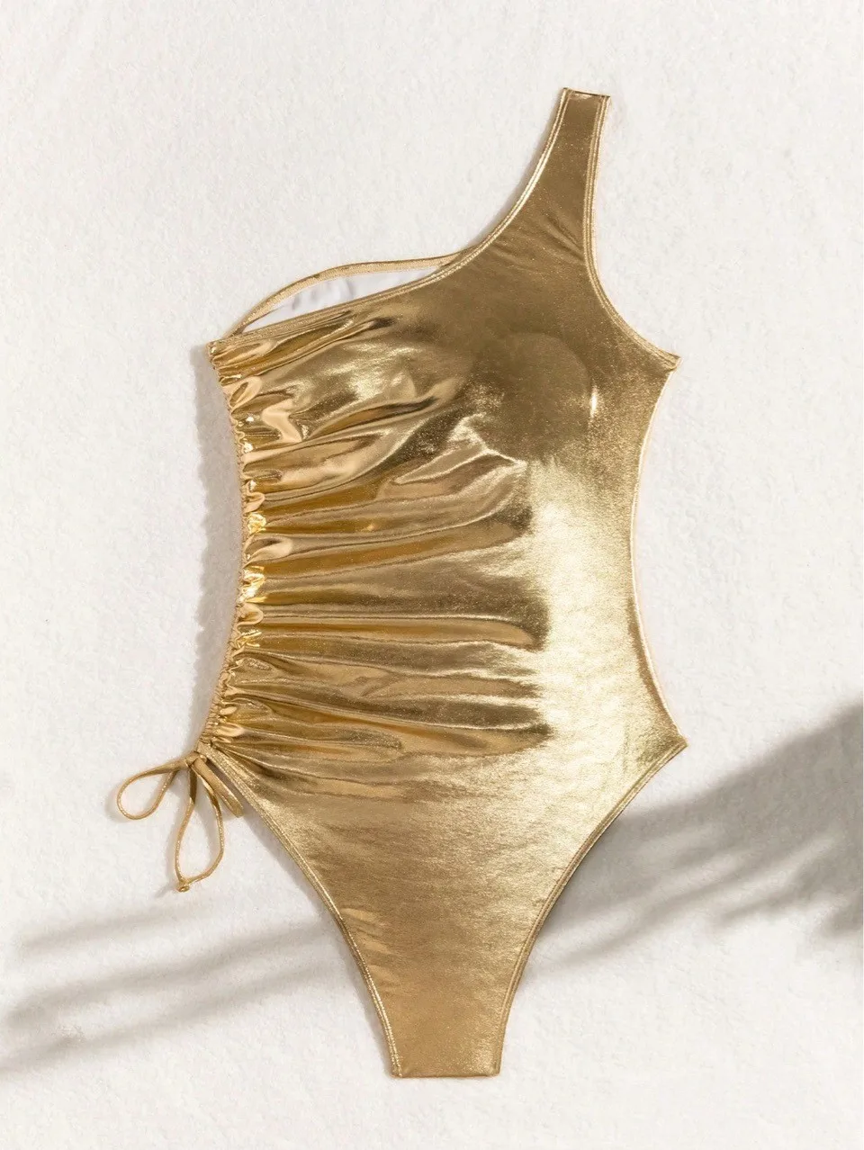 Metallic One Shoulder One Piece Swimsuit Sleeveless Wireless High Cut Summer Beach Monokini Gold