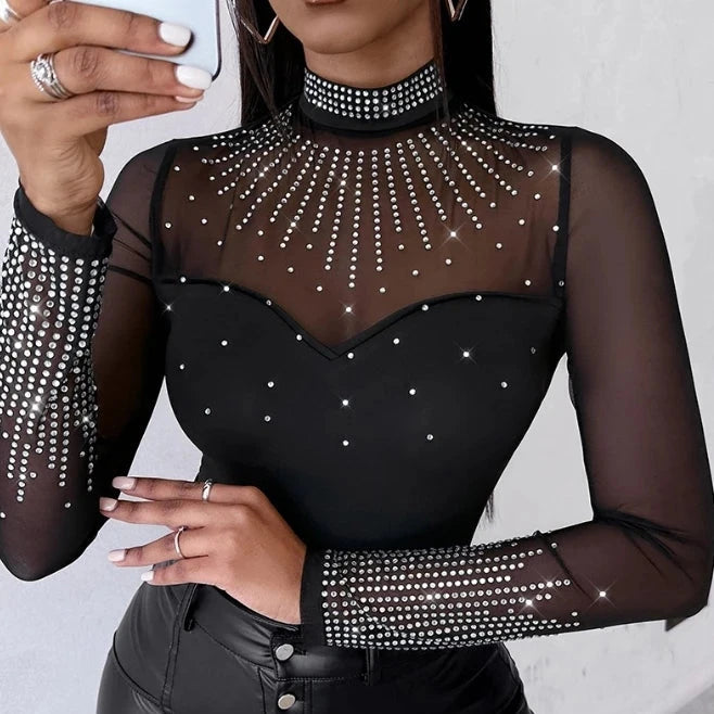 Sexy Bodysuit Women - Mock Neck Long Sleeve Rhinestone Decor Sheer - Mesh Patch Bodysuits Casual Skinny Top