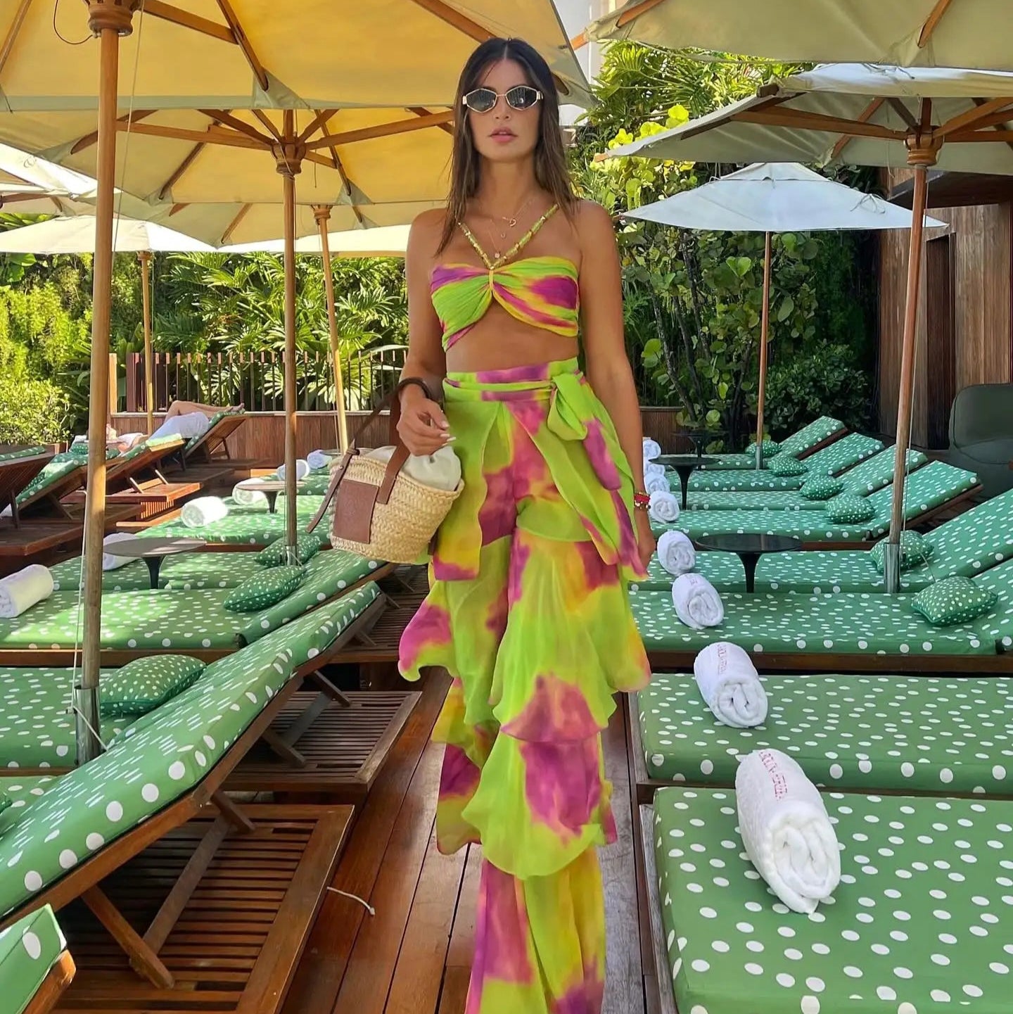 Sexy Print 3 Pics Women Bikini Set With Pants Pleated Bra High Waist Hollow Out Wide Leg Pants Suit Summer Beach Swimsuit