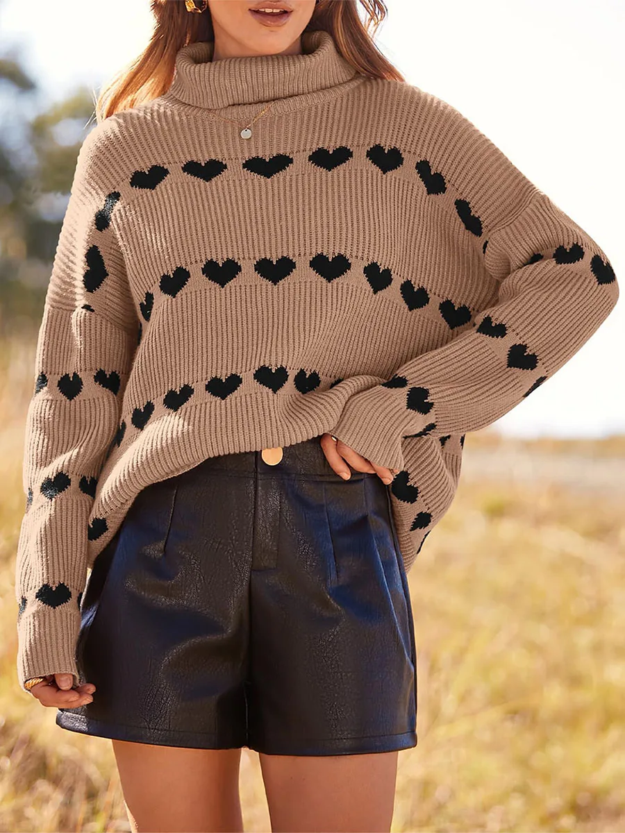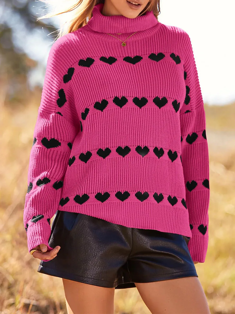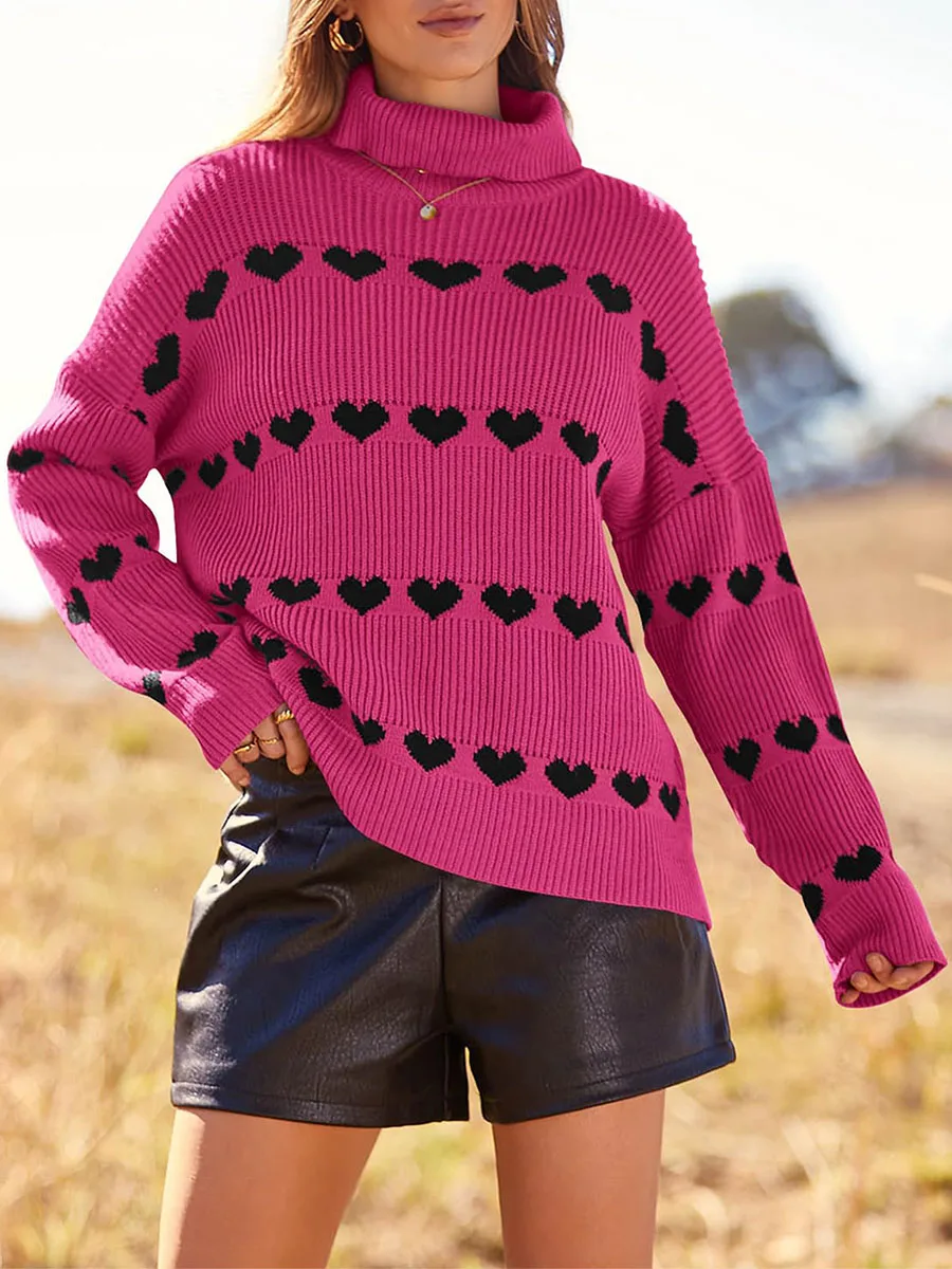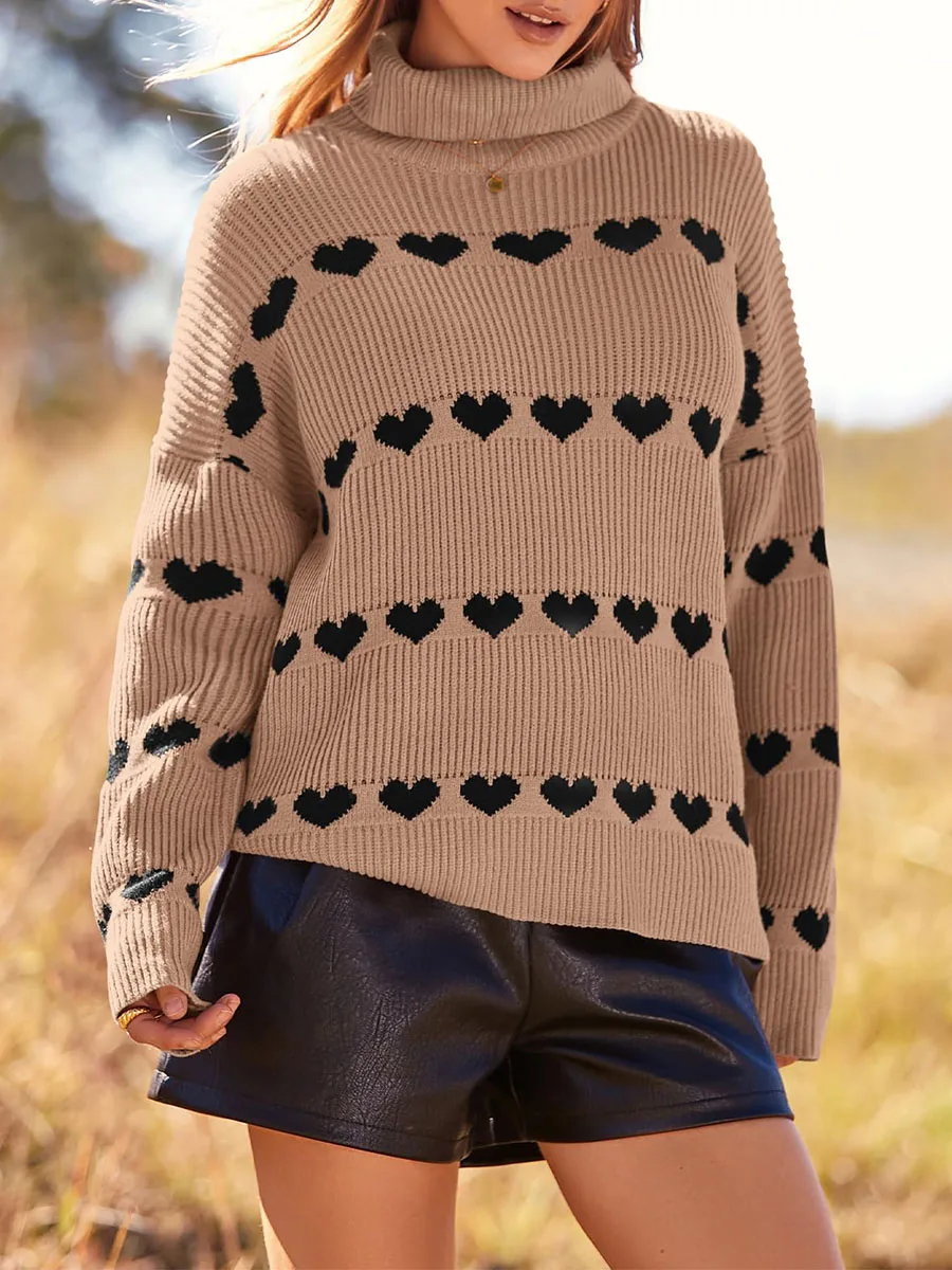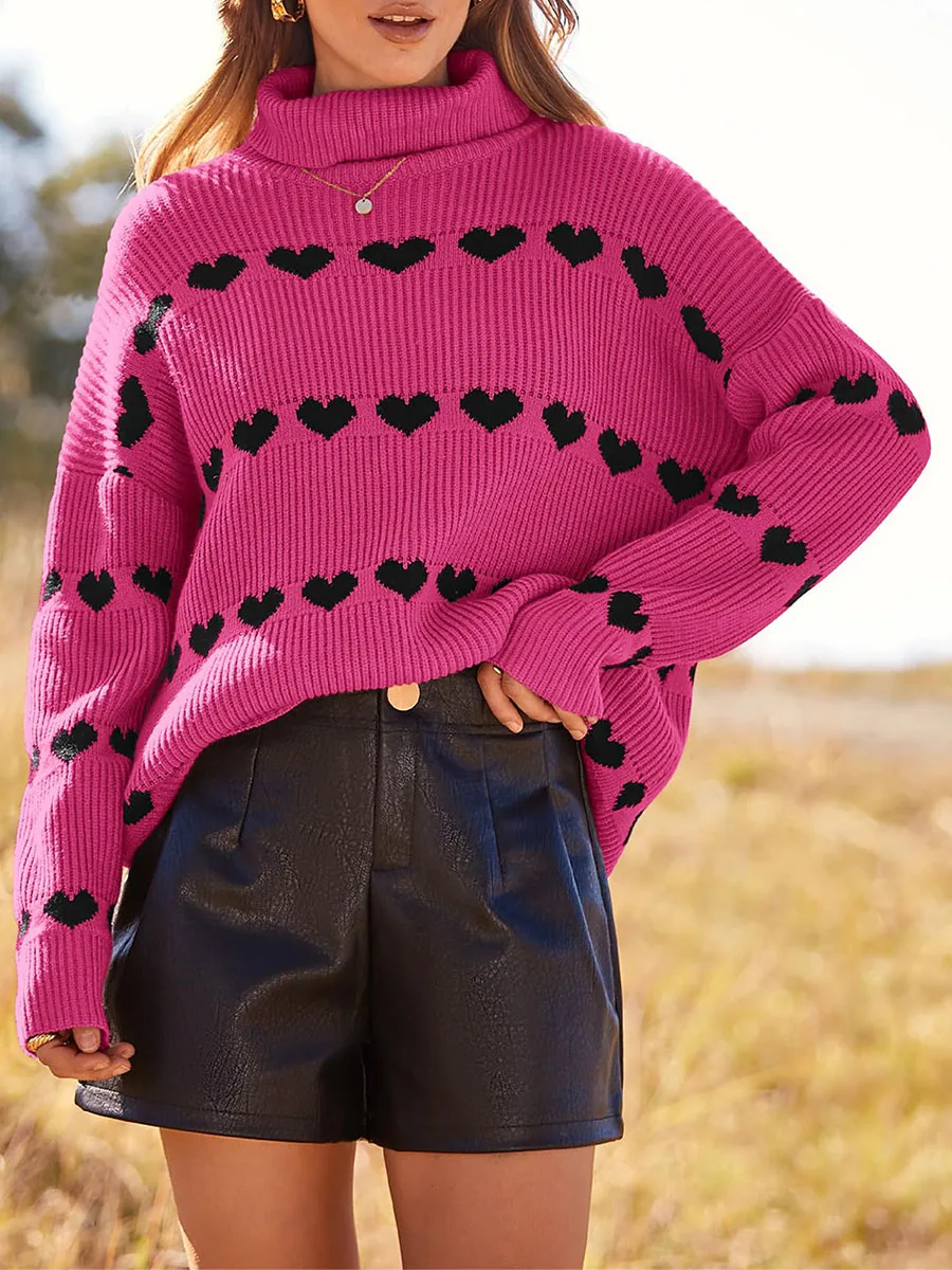 Women's Heart Print Sweaters Long Sleeve Turtleneck Oversized Pullovers Casual Knit Tops