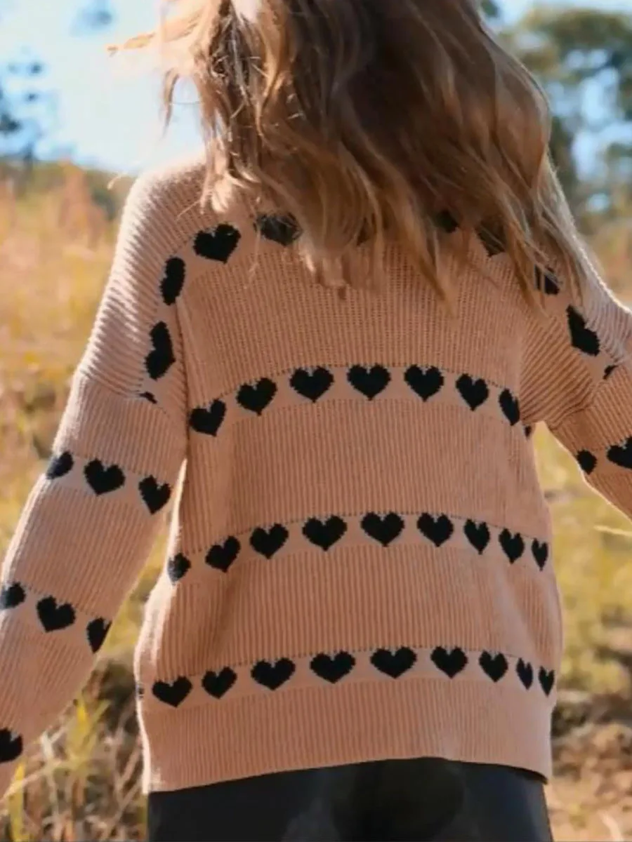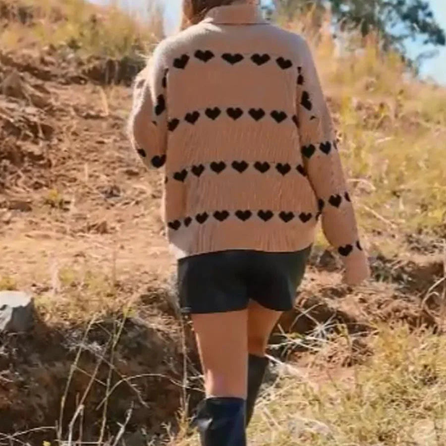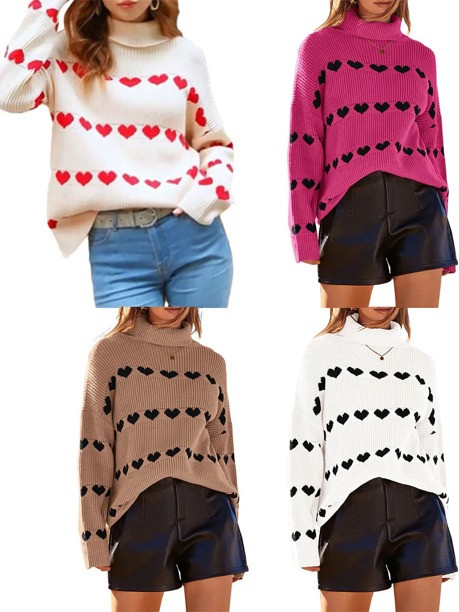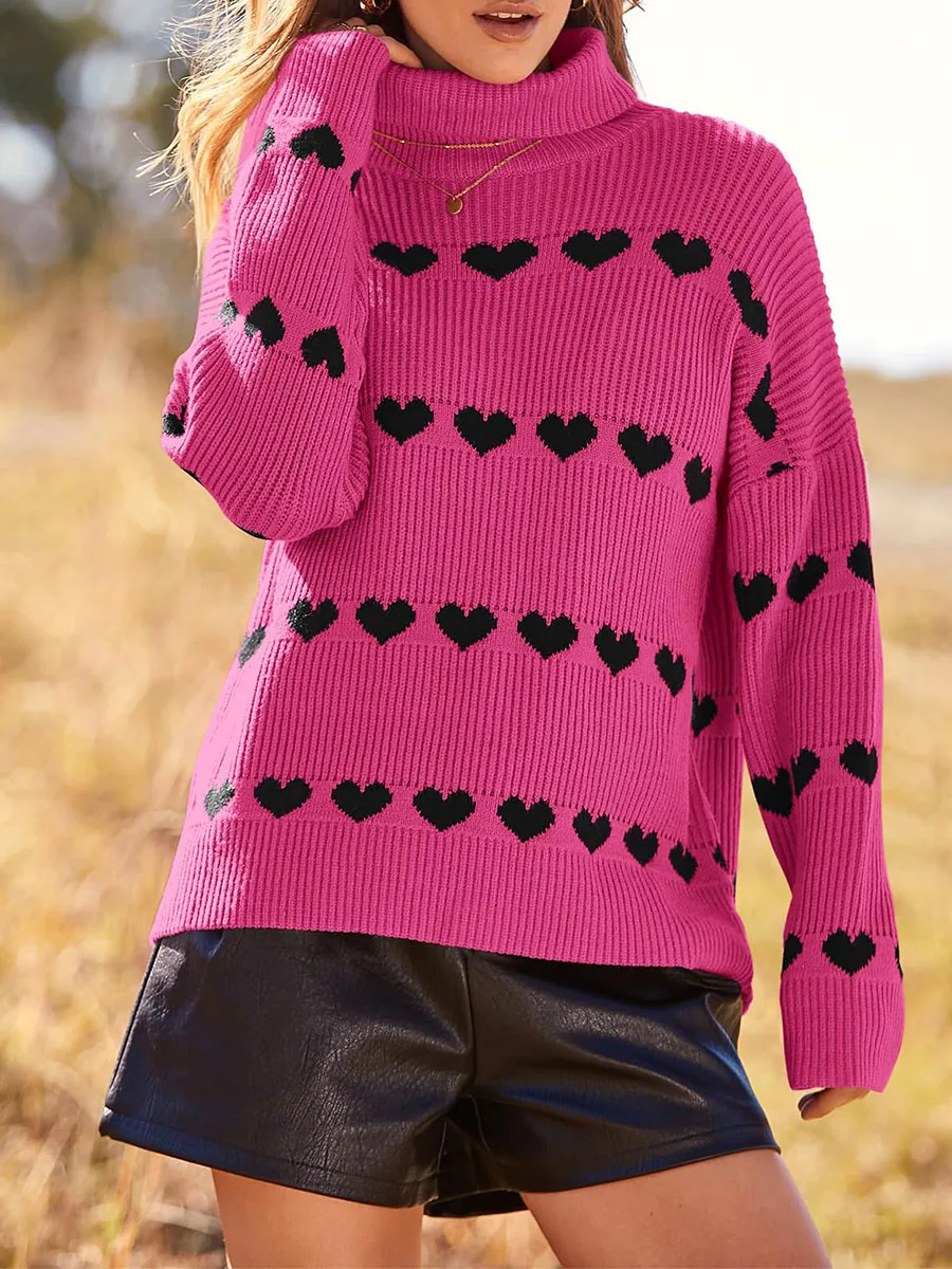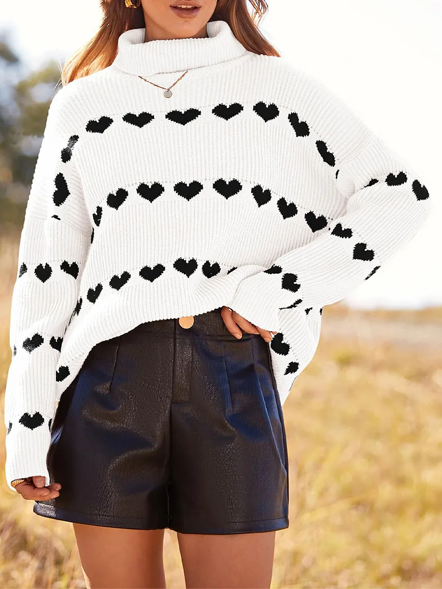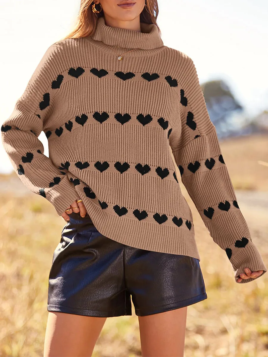 Women's Heart Print Sweaters Long Sleeve Turtleneck Oversized Pullovers Casual Knit Tops